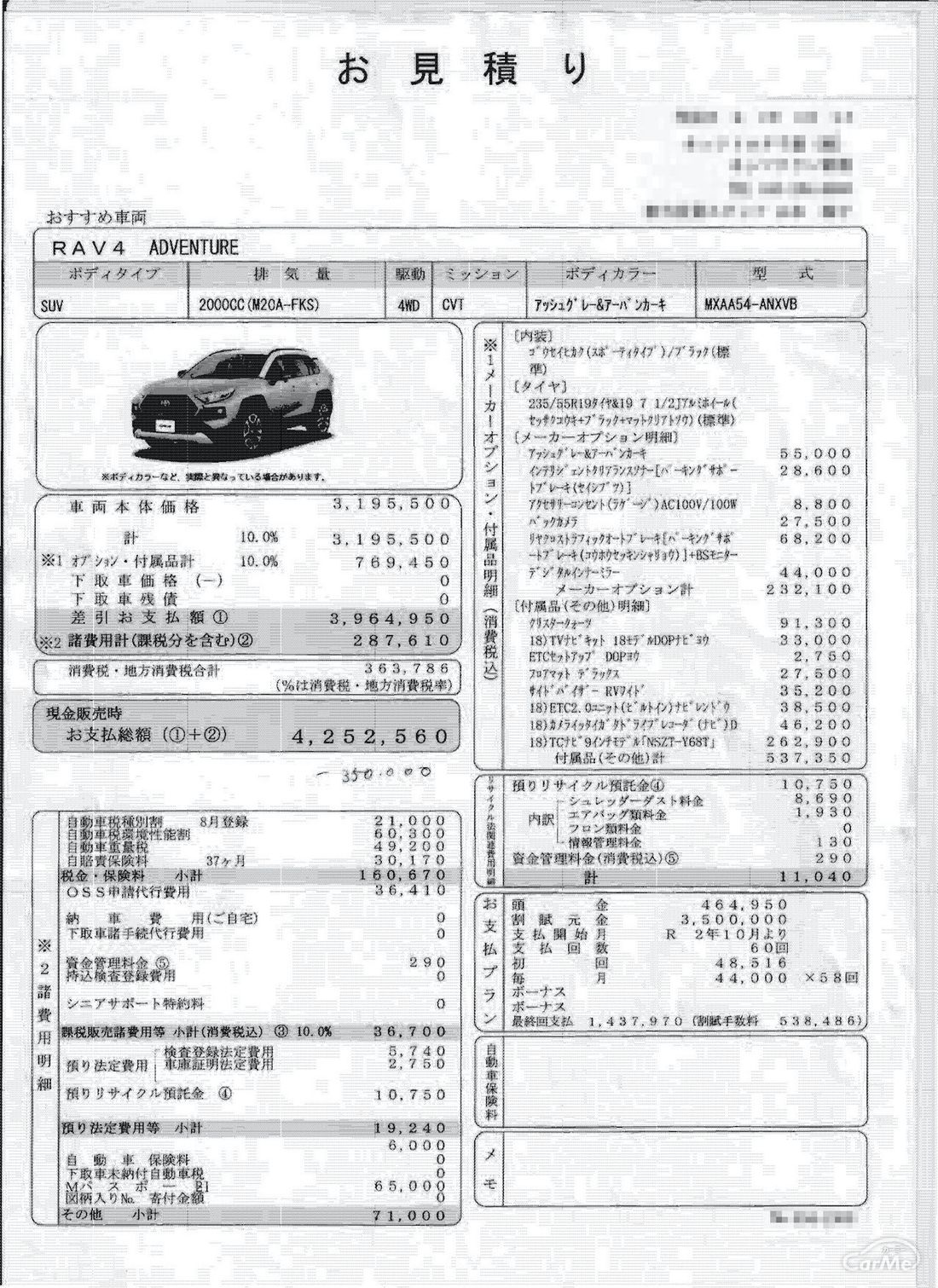 トヨタ 5代目rav4は支払い総額390万2560円 実際に見積もりを取ってみた